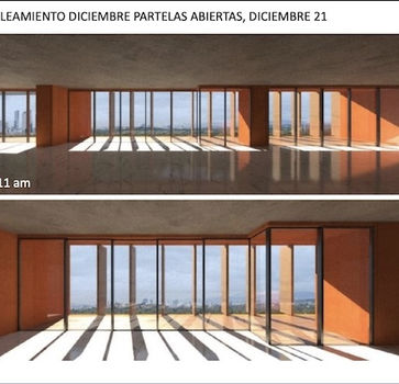 La fachada móvil de Torre Monarca está compuesta por cartelas o elementos de control solar que pueden ajustarse según la necesidad del residente. Su función no es decorativa, sino climática y espacial: ayudan a modular la entrada de luz, reducir resolana y mejorar la relación entre vista, sombra y habitabilidad.